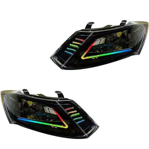چراغ جلو اسپرت با طراحی سهبعدی و قابلیت فول کالر همراه با اتصال بلوتوث برای تنظیم افکتها و رنگها؛ داخل بدنه مشکی و عملکرد دو حالته برای نور بالا و پایین. این مجموعه شامل دو عدد چراغ بدون موتور است و ظاهری اسپرت به خودرو میبخشد.